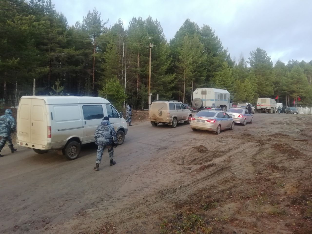 «От поста „Костёр“ колонна из трёх машин, самосвала „Мерседес“ и двух бензовозов под прикрытием силовиков отправилась по разбитой лесной дороге в направлении станции Шиес. Грузовики ОМОНа и Росгвардии остались на посту» Костер». Впереди колонны шли сотрудники силовых структур с металлоискателями и ЧОПа «Гарант безопасности» с граблями и лопатами, выискивая возможные металлические предметы, которые могли повредить колеса грузовиков. Причем первым шел самосвал «Мерседес», в кузове которого находился уголь и, судя по всему, запасные колеса. За самосвалом уже ехали два бензовоза, один из которых был с прицепом», — пишет на своей страничке в соцсети активист Леонид Сухарев.