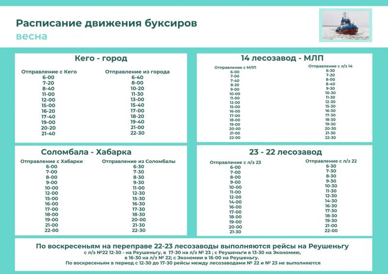 Первый будет отправляться с архангельского причала в шесть утра. На другие острова в черте города буксиры уже ходят: с «четырки» на Бревенник, из Соломбалы на Хабарку и с 23 на 22 лесозавод. До Реушеньги можно доехать по воскресеньям. Расписание ниже.